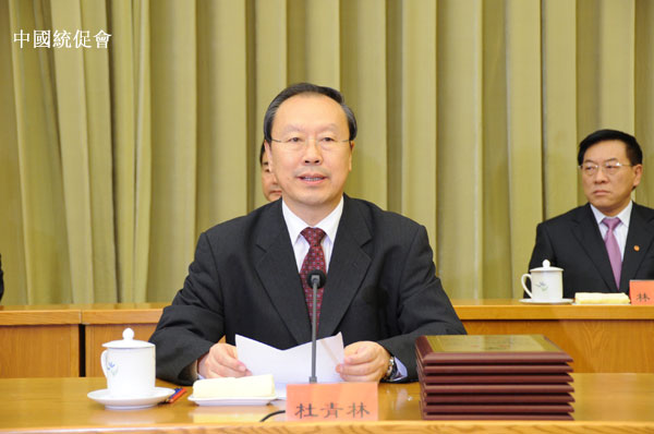 贾庆林强调,去年12月,胡锦涛同志在纪念《告台湾同胞书》发表30周年座谈会上作了重要讲话,首次全面系统地阐述了两岸关系和平发展的思想,提出了推动两岸关系和平发展的六点意见,描绘了新形势下两岸关系发展的美好蓝图。深入贯彻胡锦涛同志重要讲话精神,为两岸关系和平发展拓宽道路,为实现祖国和平统一创造条件,为中华民族伟大复兴凝聚力量,是新形势下反“独”促统运动的重大历史使命。中国和平统一促进会的全部工作,都要着眼于有效履行这一使命来开展、来深化、来推动。要谋划全局,不断开创两岸关系和平发展的崭新局面;要反对分裂,努力保持两岸关系和平发展的良好势头;要扩大交流,广泛凝聚推动两岸关系和平发展的共同意志;要加强团结,着力争取两岸关系和平发展的潜在力量,为早日实现祖国和平统一大业和中华民族伟大复兴作出新的更大贡献。