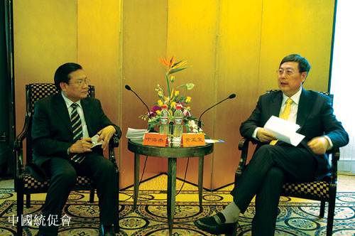 全国政协副主席、中国和平统一促进会副会长黄孟复(右)发表讲话,左为访问团团长叶海杰