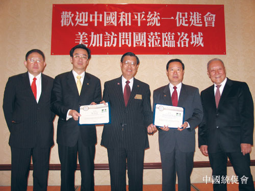拜会洛杉矶旅美黄埔同学会时,华裔市长向王在希(右二),中国和平统一促进会执行副秘书长李路(左二)颁发荣誉市民证书