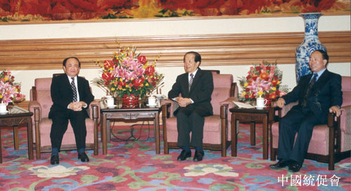 中共中央政治局委员、国务院副总理钱其琛(中)亲切会见访问团