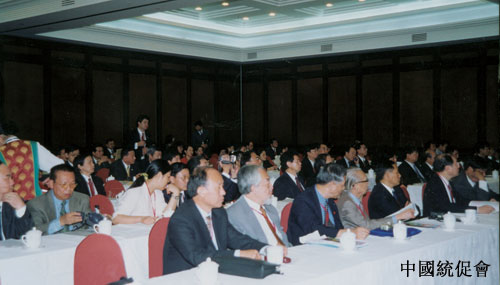 大会主席台(从右至左):全国政协副主席、中国和平统一促进会会长罗豪才、中央统战部副部长朱维群、台湾海峡两岸和平统一促进会副会长郭俊次