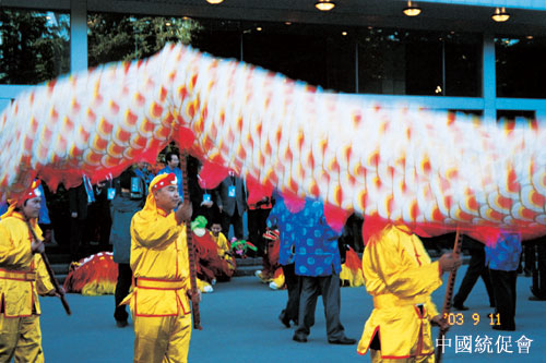 2003年9月11日晚,近千名来自世界各地的华侨华人欢聚中国俄罗斯大使馆,当地华人青年舞龙灯庆中秋