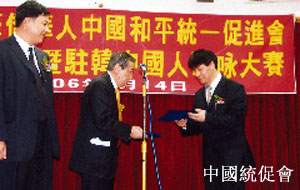 韩晟昊给首尔华侨华人中国和平统一促进会新当选的会长、监事长颁发聘书