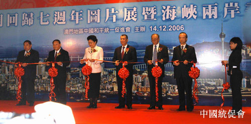 全国政协副主席、中央统战部部长、中国和平统一促进会执行副会长刘延东(左三)出席澳门回归七周年图片展暨海峡两岸书画展