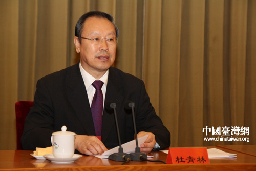 中国和平统一促进会第八届理事大会23日在京举行。全国政协副主席、中共中央统战部部长、大会执行主席杜青林受七届常务理事会委托,作了题为《把握历史机遇 凝聚强大力量 谱写推进中国和平统一大业的新篇章》的工作报告。(中国台湾网 田云鹏 摄)