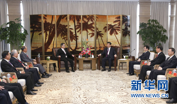 4月8日,中共中央总书记习近平在海南省博鳌会见台湾两岸共同市场基金会荣誉董事长萧万长一行。 新华社记者 庞兴雷 摄