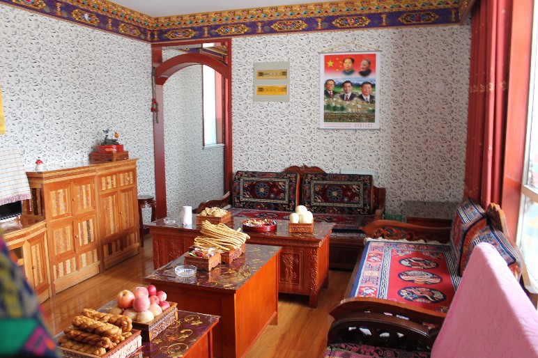 距机场大概10来分钟的路程,是巴塘地区的巴塘镇八吉村。一片红色小院映入眼帘,安静、祥和。这是震后由国家资助灾民重建起来的一片村民住宅,共80户。每户大概百来平方米,做价30万,全部由政府统一出资划建。我们来到其中一户人家,户主江永索男蛮有感情地向我们介绍了自己一家的情况,并表示;对于这一切内心充满了感激之情,从来没有想过自己会有这样房子和能过上现在这种生活。目前,八吉村村委会成立了“旅游专业合作社”带动村民通过办农家乐发家致富,组建了舞蹈队等等以配合发展旅游项目,并且聘用有专业人员作辅导。江永索男说;我更从来没有想到能有今天如此享受的生活,对于这一切,我非常感恩,感谢人们无私的援助。