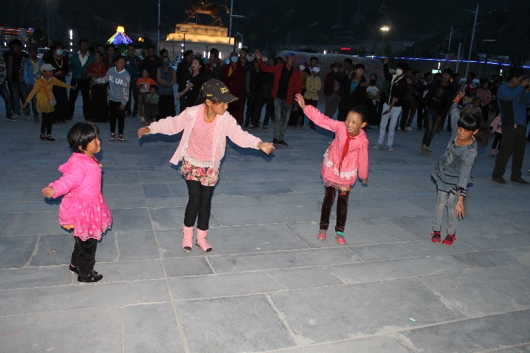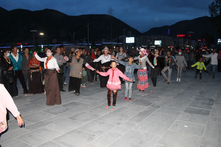 傍晚,太阳慢慢下沉,月亮犹抱琵琶半遮脸的时候,玉树人的快乐开始了。在玉树州文化中心前面的广场上,人们载歌载舞跳着郭庄,一种藏族最普及的舞蹈。锅庄舞,又称为“果卓”、“歌庄”、“卓”等,藏语意为圆圈歌舞,是藏族三大民间舞蹈之一,分布于西藏昌都、那曲,四川阿坝、甘孜,云南迪庆及青海、甘肃的藏族聚居区。锅庄分为用于大型宗教祭祀活动的“大锅庄”、用于民间传统节日的“中锅庄”和用于亲朋聚会的“小锅庄”等几种,规模和功能各有不同。舞蹈时,一般男女各排半圆拉手成圈,有一人领头,分男女一问一答,反复对唱,无乐器伴奏。整个舞蹈由先慢后快的两段舞组成,基本动作有“悠颤跨腿”、“趋步辗转”、“跨腿踏步蹲”等,舞者手臂以撩、甩、晃为主变换舞姿,队形按顺时针行进,圆圈有大有小,偶尔变换“龙摆尾”图案。
