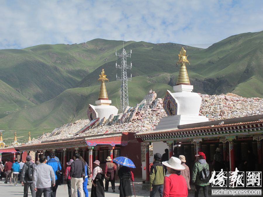 青海玉树新寨嘉那嘛呢石经城(嘛呢也写作玛尼),由藏传佛教萨迦派、结古寺第一世嘉那多德桑秋帕旺活佛创建。到上个世纪50年代石刻嘛呢石堆多达25亿块,为世界最大。以六字真言字数形成的佛塔为分界,连同经堂、转经筒走廊、经幡等等,构筑成规模宏大的经石城格局。该石经城目前仍在不断增大扩充。(侨报特派记者郑一 摄于2014年7月22日)