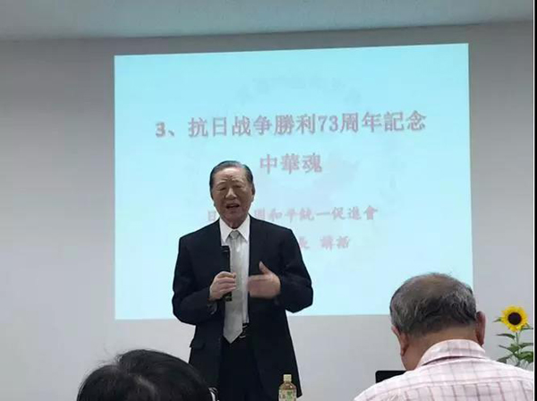第二个主题是庆祝抗日战争胜利73周年。96岁的海外著名促统人士、日本中国和平统一促进会会长陈福坡作了题为“抗日战争胜利73周年纪念——中华魂”的演讲。他告诫后辈,要牢牢记住中华民族兴衰成败的艰难历程,为中国和平统一大业精诚团结,努力工作。
