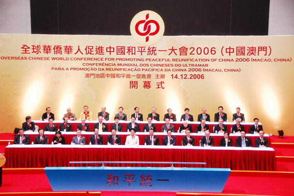 2006年12月14日,澳门地区中国和平统一促进会主办“全球华侨华人推动中国和平统一大会”,来自全球50个国家和地区的1000余名代表出席。中共中央政治局常委、全国政协主席、中国统促会会长贾庆林致信祝贺。全国政协副主席、中央统战部部长刘延东等出席大会并做主旨发言。与会代表围绕促进祖国和平统一主题,畅谈两岸关系和平发展,共同抒发中华儿女的爱国情怀,展望了祖国和平统一的光明前景。会后,发表了《澳门大会宣言》,呼吁全球华侨华人和中国大陆、台港澳同胞携起手来,勇担历史使命,坚定统一信念,坚决反对“台独”活动,把智慧和力量凝聚到促进国家和平统一的伟大事业上来。