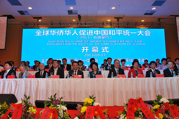 2013年10月17日,巴西中国和平统一促进会与里约中国和平统一促进会联合主办了“全球华侨华人促进中国和平统一(2013·里约)大会”,本次大会是首次在南美洲举办的全球性反“独”促统大会,填补了中南美洲的大会空白。第十一届全国人大常委会副委员长、中国统促会副会长桑国卫出席大会并做主旨讲话,巴西政要、各国统促会代表应邀参会,与会者共400余人。大会以“共促和平统一,同圆中华梦想”为主题,开展了一系列演讲、讨论、讲座和交流等活动,取得丰硕成果。大会通过了《里约热内卢宣言》,指出此次大会极大鼓舞了南美各统促会的工作热情,坚定了南美地区反“独”促统的信心,呼吁全球华侨华人充分利用自身独特条件,为推动中国统一创造良好的外部环境。