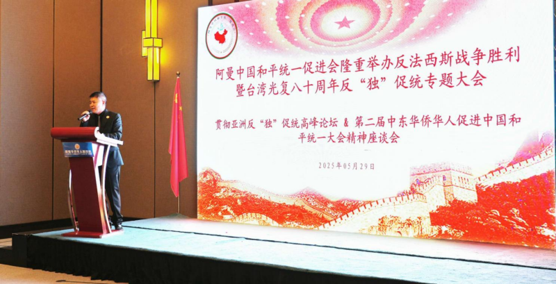 2025年5月29日中午12时 ,纪念反法西斯战争胜利暨台湾光复80周年、贯彻亚洲反“独” 促统高峰论坛及第二届中东华侨华人促进祖国和平统一大会精神专题会议,在阿曼隆重召开。此次会议由阿曼中国和平统一促进会主办 ,会议由执行秘书长司铭女士主持。来自阿曼各界侨团代表及热爱祖国的华侨华人共计60余人出席此次会议。